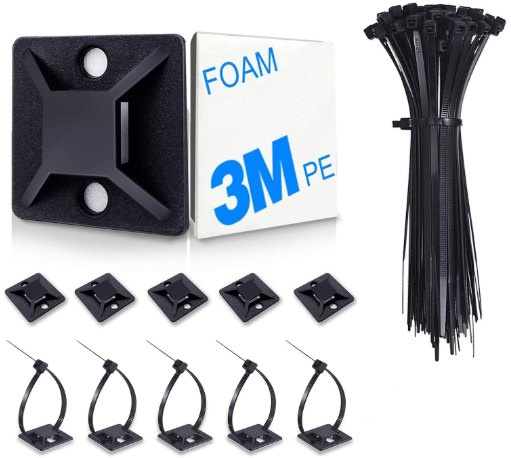 Description:Huasai 4/5" Self-Adhesive-Backed Zip Tie Mount W/ Cable Ties, Black, 100-Pack