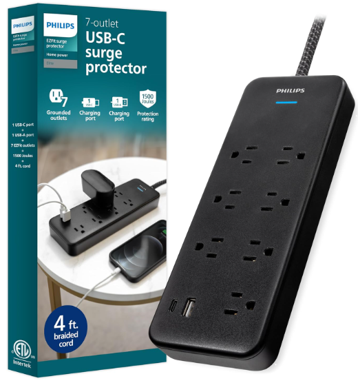 | Description: | Philips 7-Outlet Surge Protector Power Strip W/ 4ft Braided Cord & USB Charging, Black | |||