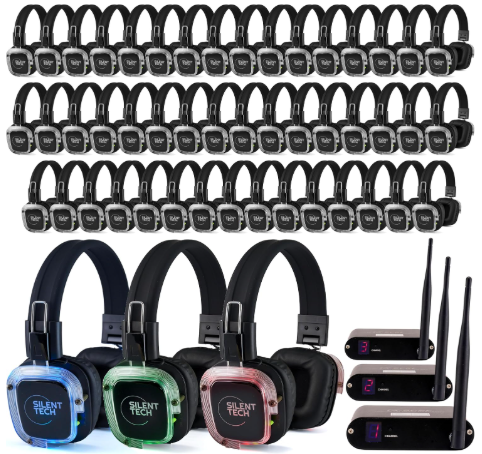 | Description: | Silent Tech Store Silent Disco In A Box W/ 50x LED Wireless Headphones & 3x Channel Transmitters | |||