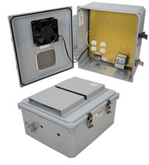 Description:14x12x06 Polycarbonate Weatherproof Outdoor IP24 NEMA 3R Enclosure, 120 VAC MNT PLT, User Adjustable Thermostat Heat & Fan DKGY