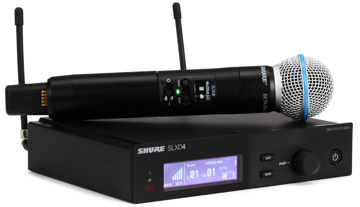 Description:Shure Digital Wireless Microphone System W/ SLXD2 Handheld Transmitter With BETA 58A Vocal Mic Capsule And SLXD4 Single Channel Rack Mount Receive