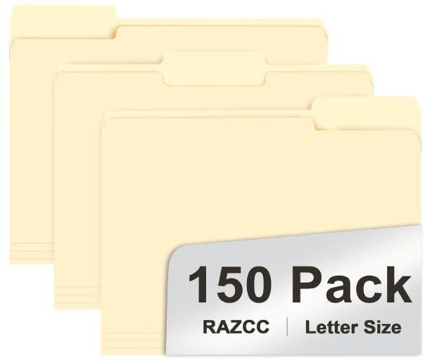 Description:Razcc 1/3 Cut Tab Manila Folders, 150-Pack