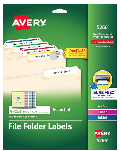 Description:Avery TrueBlock File Folder Labels, 2/3" X 3-7/16", 750 Printable Labels, Assorted Colors, Permanent