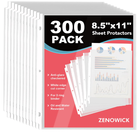 Description:Zenowick 300 Pack Sheet Protectors 8.5 X 11 Inch Page Protectors For 3 Ring Binder, Plastic Clear Sheet Protectors For Document, Paper