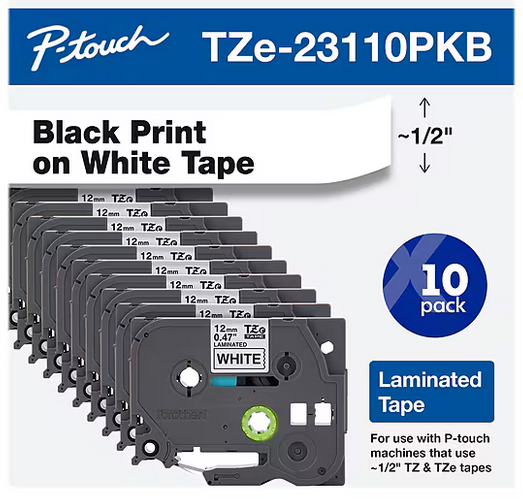 | Description: | Brother P-touch Laminated Label Maker Tape, 1/2" X 26-2/10', Black On White, 10-Pack | |||