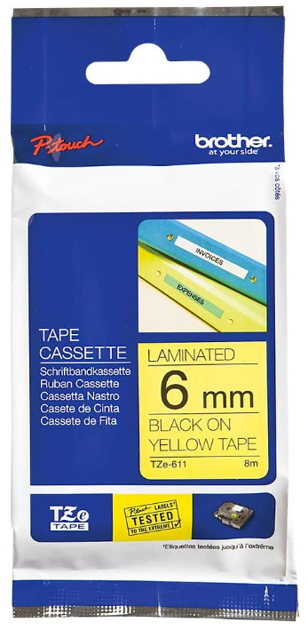 Description:Brother Labelling Tape Cassette 6 Mm (W) X 8 M (L), Laminated, Black On Yellow