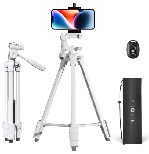 | Description: | PhoPik 55" Extendable Tripod Phone Stand W/ Shutter, White | |||